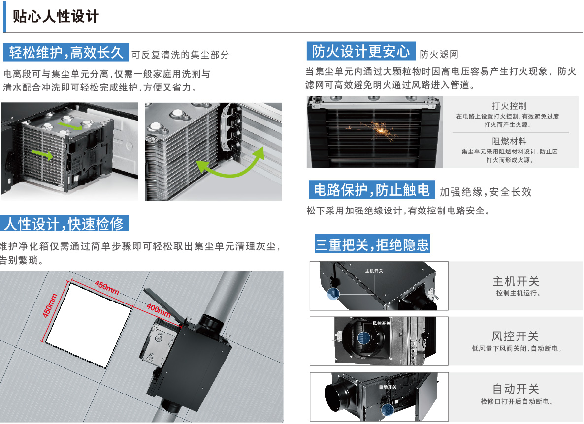 空氣凈化的第一道防線、三重安全開關,阻燃,絕緣材料的高安全性、高凈化率、簡單水洗,維護方便、臭氧含量遠低于國標IEC標準