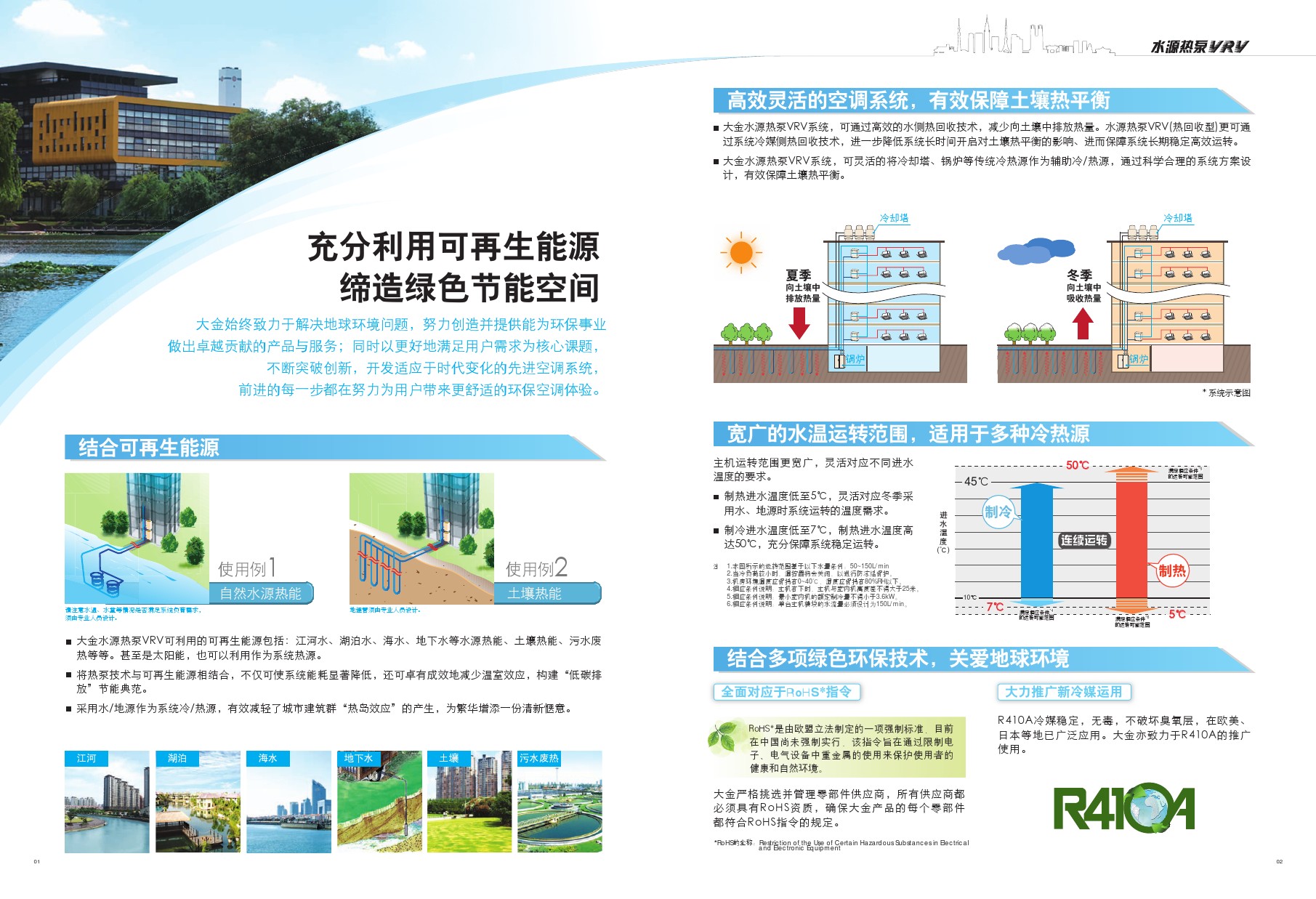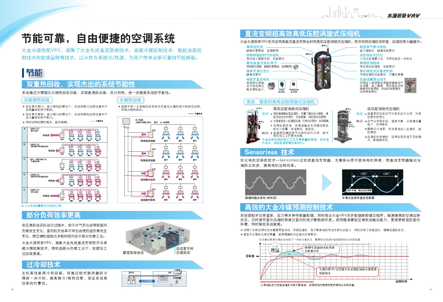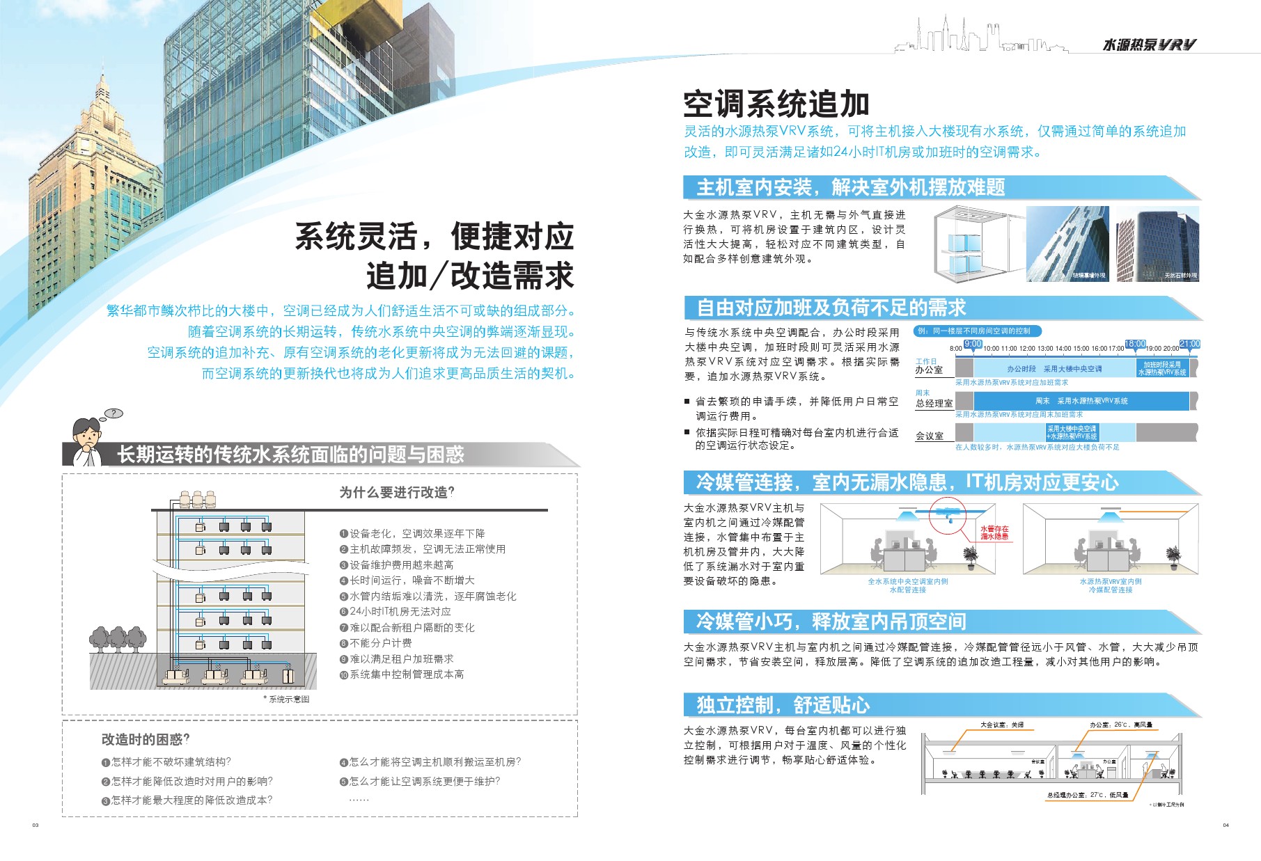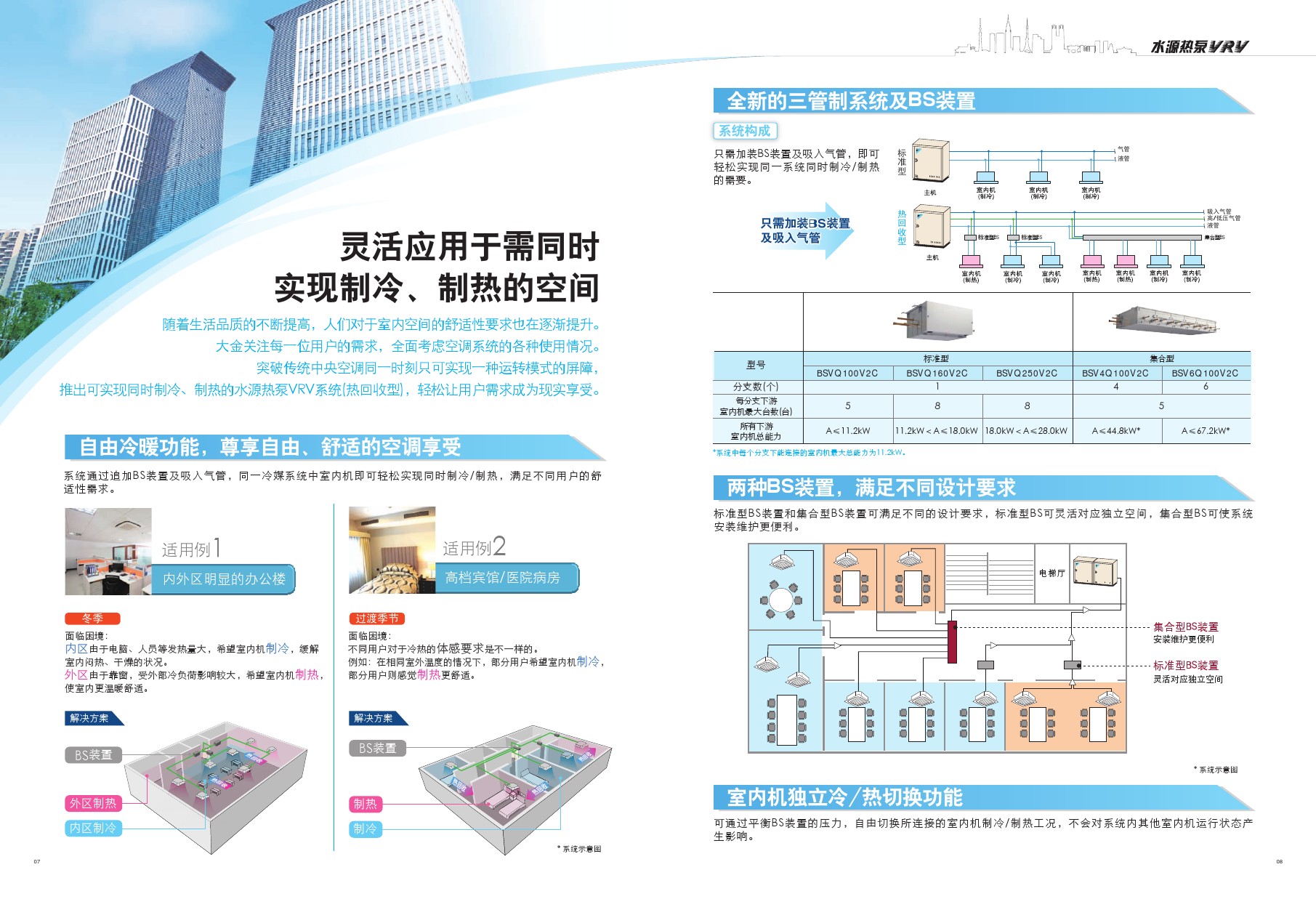 秉承了VRV系列產品的節能、管理控制方便等優點,在室外換熱側采用了水源作為冷熱源,水側無高低差及管長限制、設計、安裝自由度高。熱源側除傳統的鍋爐冷卻塔以外,還可以利用水/地源等可再生能源,讓各類不同需求的現代化建筑的空調方案更加靈活和節能。