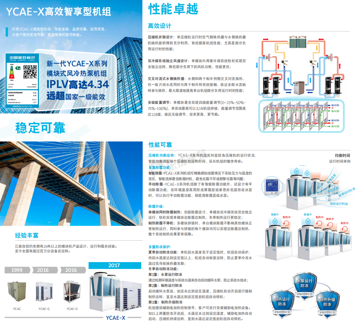 約克模塊式風冷冷水/熱泵機組傳承YORK®多年模塊機設計、制造、運行和服務經驗,致力于打造約克YCAE-X高效型機組,性能卓越、穩定可靠、智能控制、應用靈活和低碳環保的機組, 為客戶提供更高效節能。X-Power系列以其超高效的性能引領模塊式風冷冷水/熱泵機組市場。
