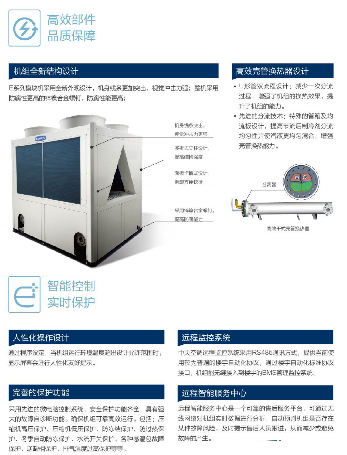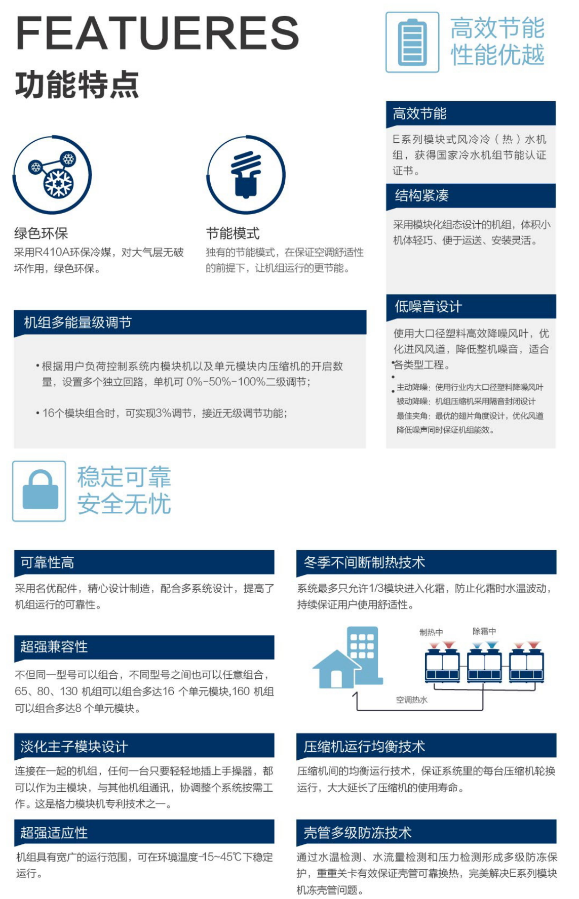產品概述 格力E系列模塊式風冷冷(熱)水機組?格力在D系列模塊式風冷冷(熱)水機組的基礎上,不斷開拓創新,開發岀新一代?節能環保產品:E系列模塊式風冷冷(熱)水機組。該機組可組合多個單元模塊,?每個單元模塊的名義制冷量不同,有65kW、80kW、130kW. 160kW 可選。?65、80、130機組每個單元模塊有兩個完全獨立的制冷系統,160 贈每個單元?模塊有四個完全獨立的制冷系統。通過組合1 ~ 16個相同或不同的單元模塊,機?組形成制冷量在65 ~ 2080kW范圍的系列產品。65、80、130機組可以組合多?達16個單元模塊,160機組可以組合多達8個單元模塊。?E系列模塊式風冷冷(熱)水機組廣泛應用于新建和改建的大小2DIE與民用建筑空?調工程。對噪音和周圍環境有較高要求、不便安裝冷卻塔的工程,模塊式風冷冷?(熱)水機組更是您理想的選擇。 |