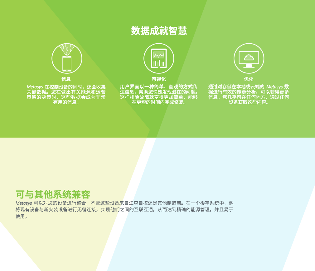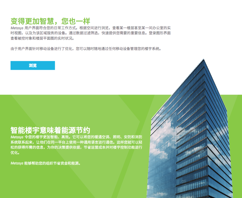 自定義儀表盤,可按照部件及設備的類別對Metasys®用戶界面進行個性化設置,以便適應多樣化的操作風格,從而提高操作者的效率。此外,自定義表現形式,這一功能使Metasys®用戶界面可以靈活地定制動態符號和圖標來匹配各企業需要或當地標準。在視覺方面,Metasys® 9.0還配備前所未有的導航便捷性、為移動設備自動優化的界面、以及采用HTML5設計的極具現代感和真實感的圖形等新功能,進一步增強了Metasys®用戶界面的卓越性能。