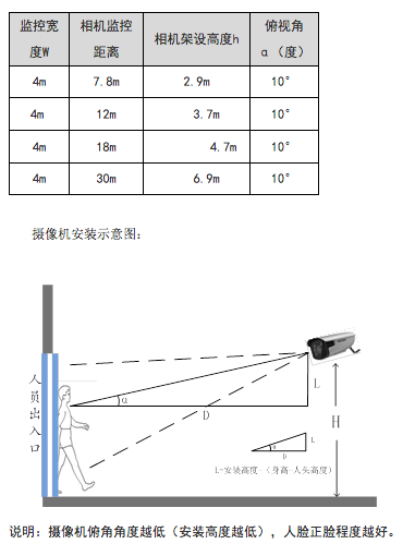 攝像機俯視角度15°±5° 水平偏轉角度α<25°