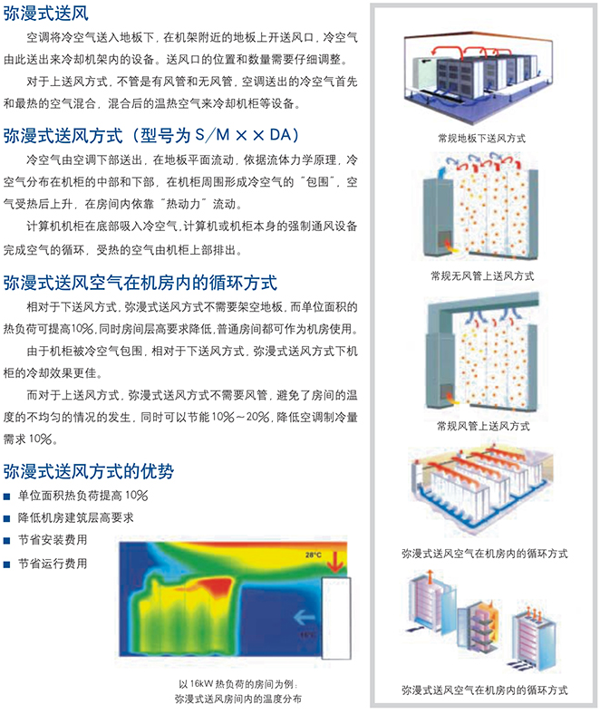 同時采用彌漫式送風方式,獲得最優性能的同時,節省用戶投資,最大限度降低機房層高要求插入式風機、大面積蒸發器、渦旋式壓縮機、優化的制冷系統使節能性能顯著提高